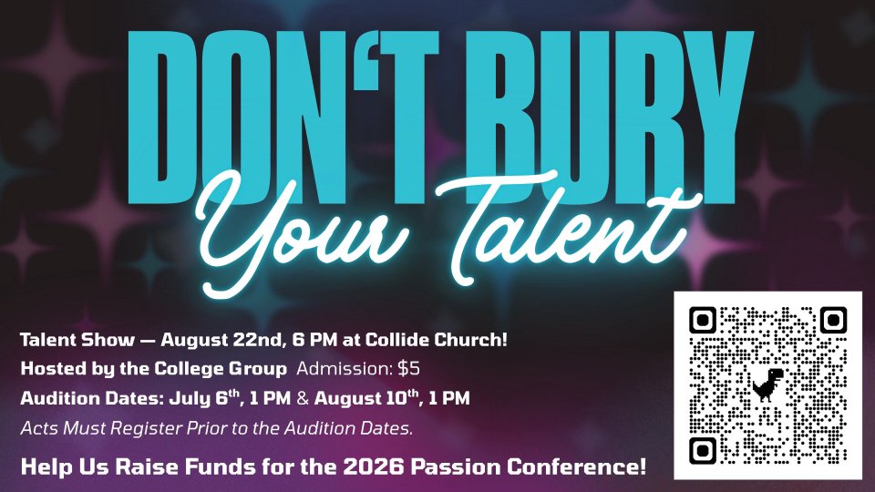 Help the Collide College Group raise money for the 2026 Passion Conference! Click the link below to register for auditions for the talent show!