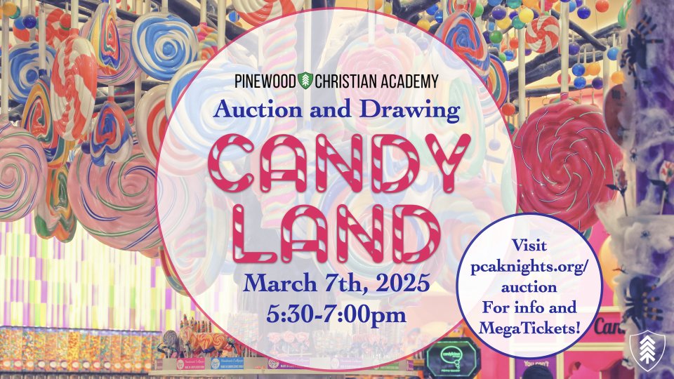 Friday, March 7th, you are invited to join us for our annual PCA Auction and Mega Ticket Drawing! Join us at 5:30pm in The Gym for a fun evening and lots of prizes available to win! Purchase your Mega Tickets today - all Mega Tickets will be sold online this year ! Winners will be drawn during the auction. You do NOT need to be present to win. All proceeds benefit Pinewood Christian Academy. Please contact the School Office with any questions at (904) 272-6408. Visit www.pcaknights.org/auction for more information about prizes!