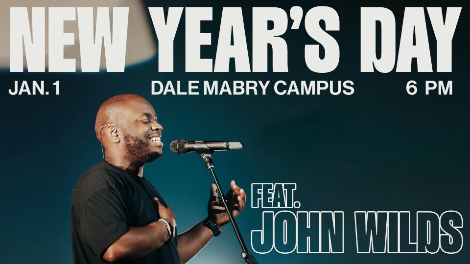 We invite you to meet with us on Wednesday, January 1, at 7:00 PM at our Dale Mabry campus. Doors will open at 6:00 PM for a pre-service party and fellowship in the lobby and parking lot. We are excited to welcome guest worship artist John Wilds, Worship Pastor of Calvary Christian Center and Bethel Music.