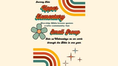 This is for students in 3rd - 5th grade for the 2025-2026 school year. Small Groups run August 27th - May 27th meeting each Wednesday from 6:30-8:30pm, upstairs in the Kids Center. We will take breaks the following Wednesdays: November 26 December 24 & 31 April 1 & 8 Optional dinner is served for $5 starting at 6:30pm. Dinner is served in conjunction with Student Ministries Small Groups out of the Side Room. If you choose to purchase dinner for your child please go through the line with them and walk them upstairs to the Upper Elementary Room for check in. From 7-8:30pm we will worship, play games and study in community. Please email our Upper Elementary Associate at svazquez@journeycom.org with any questions!
