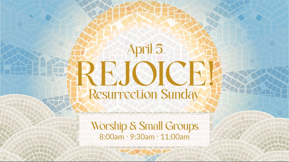 Celebrate Resurrection Sunday with us on April 5 at 8:00, 9:30, or 11:00am! Small Groups will be held as scheduled. Preschool activities will be available, and all kids grades 1-6 will worship with their families.