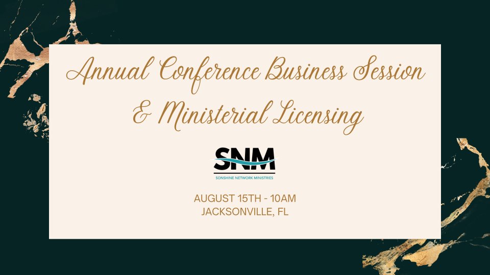 Join us for the SNM Conference Annual Business Session on August 15th at 10am at Harvest Ministries in Jacksonville. The event will feature a message from the General Superintendent's Office, reports from World Missions & Discipleship Ministries, conference business discussions, and Ministerial Licensing. Don't miss this inspiring and informative day!