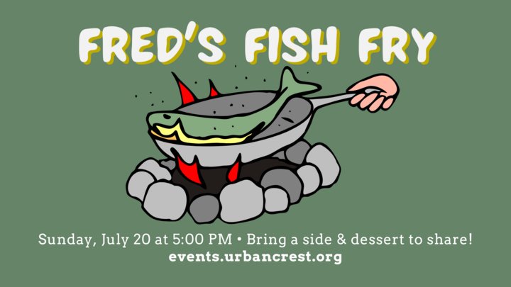 You're invited to join us for Fred's "Famous" Fish Fry on Sunday, July 20 at 5:00 PM! All are welcome to attend. There will be hot dogs available for those who don't like fish. Please bring a side and dessert to share, and reach out to the Urbancrest office with any questions at office@urbancrest.org.