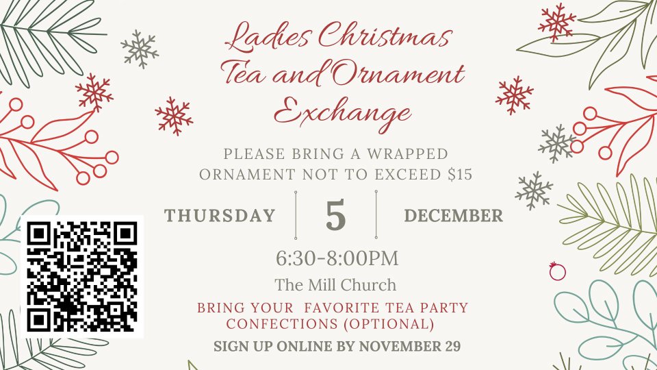 Join us for our Ladies Christmas Tea and Ornament Exchange on Thursday, December 5th from 6:30-8:00PM at The Mill Church!