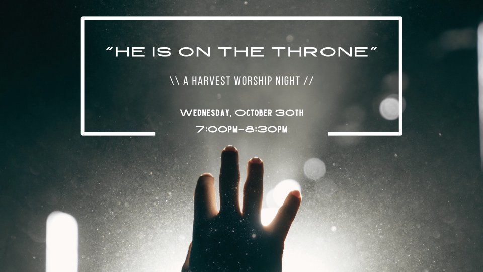 Gather with us on October 30th from 7:00pm to 8:30pm for "Night of Worship: He is on The Throne." Bring your friends and family, and together we will look to our true and greater king: Jesus!