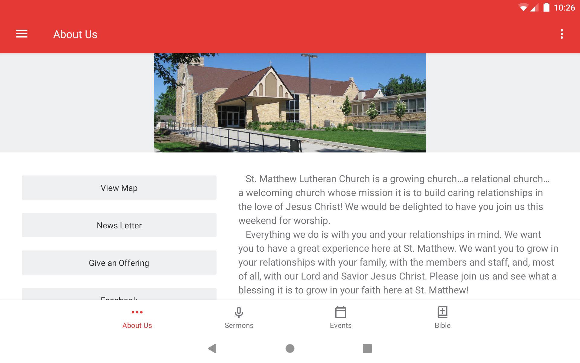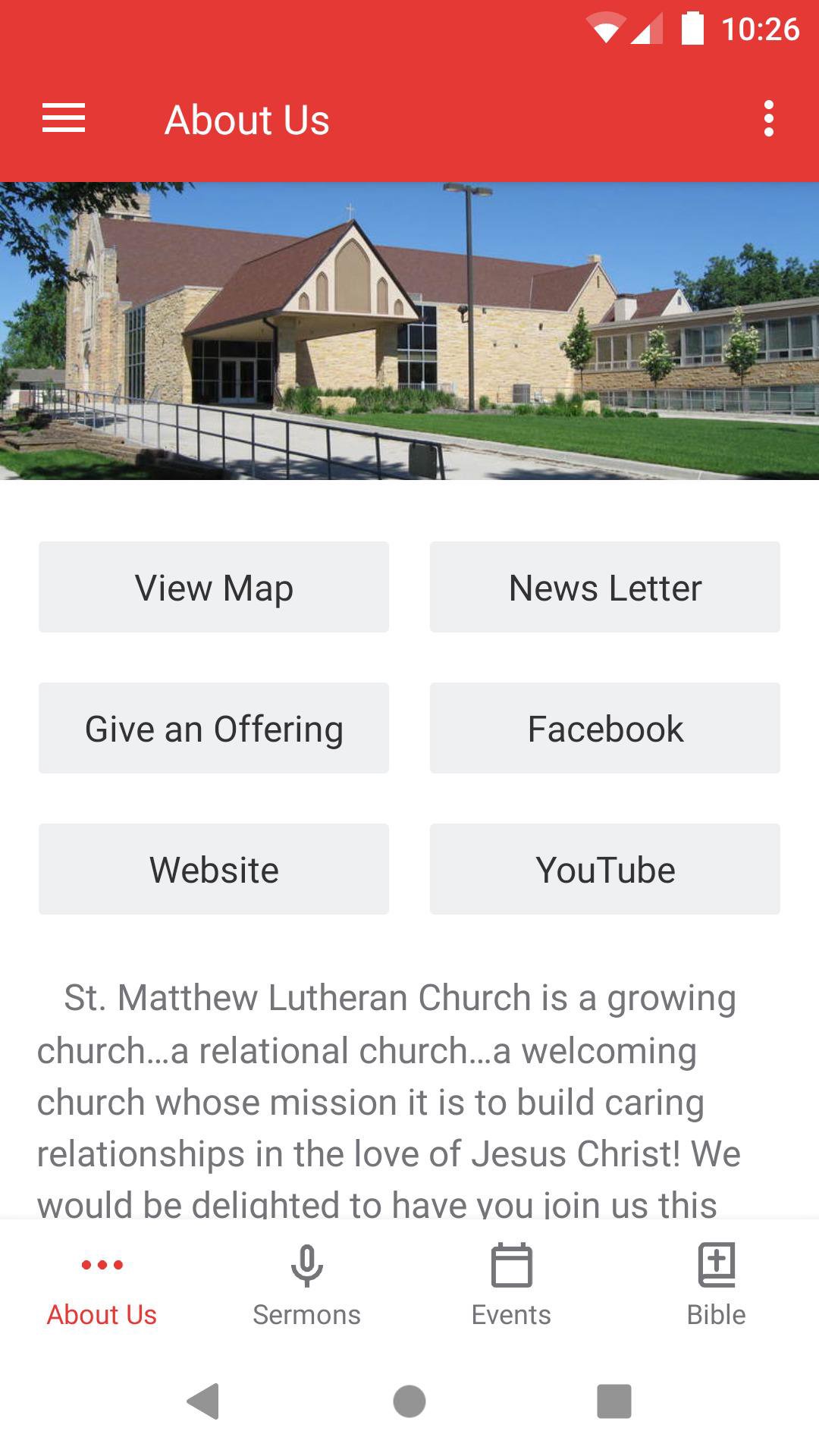 This app is packed with powerful content and resources to help you stay connected St Matthew Lutheran Church in Worthington Minnesota. With this app you can: - Watch or listen to past messages - Follow along with our Bible reading plan - Sign up for events - Stay up to date with push notifications - Download messages for offline listening - Stay connected to our Facebook page and web-site content