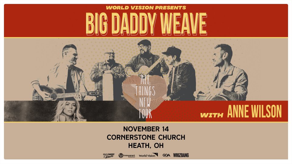 Big Daddy Weave November 14th // Cornerstone Church - Heath, OH ---------------------------- ON SALE NOW! 5:00pm — Premium doors open 5:15pm — Pre-show conversation with Mike Weaver of Big Daddy Weave 5:45pm — Early Entry doors open 6:00pm — General doors open 7:00pm — Concert begins General Information: All seating is general admission - first come, first served. All ticket prices subject to increase when purchased at the door. Children 3 & under are free if they will be sitting in a lap. Purchases are non-refundable. Visit us at https://transparentproductions.com/ to find more events near you. Originally scheduled for April 2nd and October 22nd and March 24th; all previously purchased tickets will be valid ---------------------------- transparentproductions.com