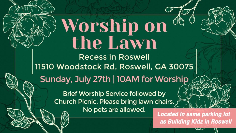 SGCC will be having a special outdoor service on Sunday, July 27th at 10AM. The event will take place on the green space in Recess in Roswell, located in the same parking lot as Building Kidz in Roswell. We will hold a brief Worship Service followed by a Church Picnic.