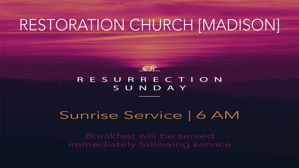 On Resurrection Sunday, Restoration Church's Madison campus will hold a sunrise service. Service will begin at 6AM with breakfast served immediately afterward!