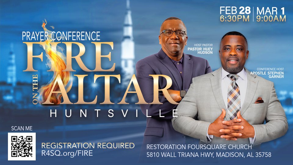 Restoration Church will host a prayer conference at the Madison campus on Friday, February 28, and March 1, 2025! Apostle Stephen A. Garner will lead this gathering as we seek to ignite the hearts of the people for the things of God and build an expectation for all that the Lord has promised His children. Registration is required, and the early bird rates will only run through October!