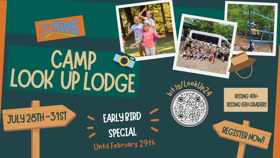 Extended Registration! Camp Look Up Lodge is a non-stop, fun camp experience that will help your child grow in their faith. This camp will be July 28th-31st and is available to rising 4th- rising 6th graders. Secure your spot now! A non-refundable deposit is due at the time of registration. Register now using the link!