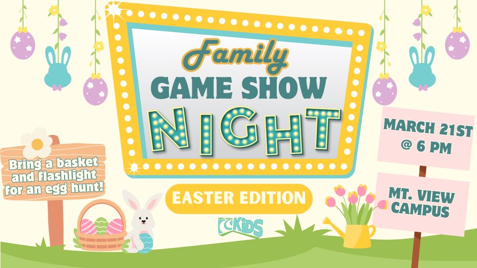 Join us for Family Game Show Night: Easter Edition on March 21st at 6pm at our Mt. View campus. There will be games, laughter, an egg hunt, and we'll celebrate the hope we have because Jesus is alive! Bring a basket and flashlight!