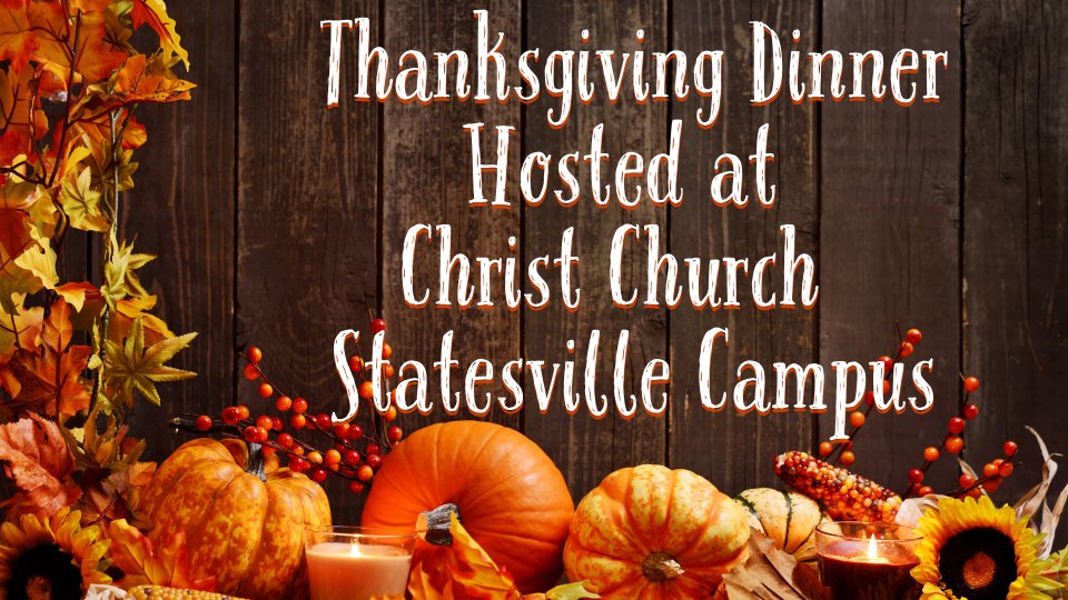 *You're Invited to a Heartwarming Thanksgiving Dinner!* Hosted at the Statesville Christ Church Campus by Celebrate Recovery A big table will be ready for anyone in need of food or good company. Don't eat alone this Thanksgiving. Instead, join our wonderful Celebrate Recovery community for a FREE Thanksgiving dinner! **What to Expect:** - Delicious Thanksgiving meal - Warm and friendly atmosphere - Great company **How You Can Help:** - **Bring Food:** If you'd like to contribute to the feast, please sign up to bring a dish. We appreciate your generosity! - **Serve the Meal:** We also need helping hands to make this event a success. Sign up to be part of the serving team.