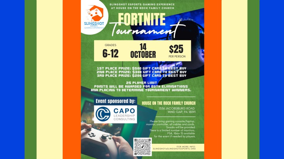 Youth grades 6-12 are welcome to come and compete for great prizes at this Fortnite tournament sponsored by Slingshot E-Sports. Cost to register is $25 per person and there are only 25 spots available so sign up soon.