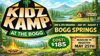 We are gearing for our Summer Trip and want all completed 3rd and 4th to Boggs Springs for Kids Kamp for our 4th year. It is a great experience for 3rd and 4th graders to dive deeper into God’s Word and grow in their faith. We will leave on the morning of July 29th - be back the afternoon of August 1st. Cost will be 185 and deadline is May 25th.