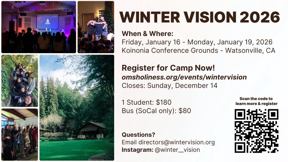 Winter Vision (January 16th-29th, 2026) is the Holiness Conference's annual weekend camp for students 6th-12th grade to gather to know Christ, grow deeper in relationship with Him, and go make disciples of Christ. To learn more and register, please go to https://www.omsholiness.org/events/wintervision