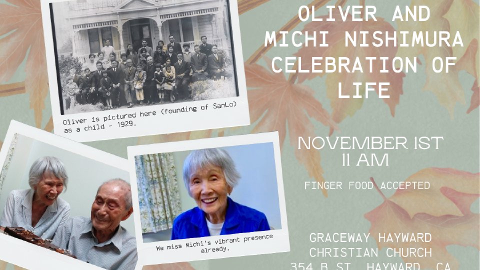 We will be having a celebration of life service for Michi and Oliver Nishimura Nov 1st at 11:00am with a reception following. Finger foods are welcomed.