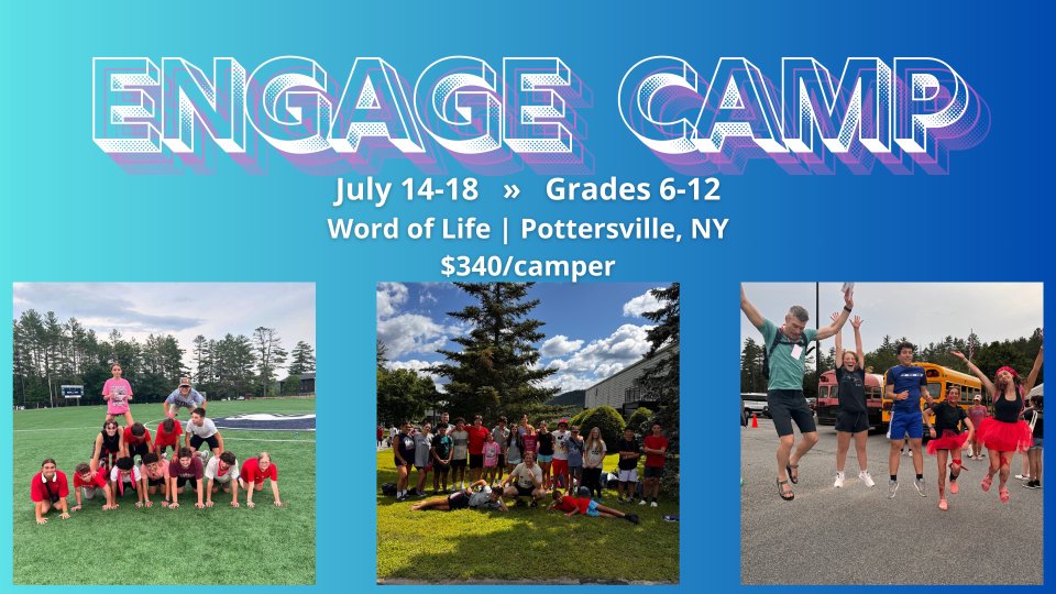 Engage Camp is the highlight of Elevates summer calendar! The dates for Engage Camp - July 14-18 - $340 per student. It is for students going into the 7th grade through 12th grade. Engage Camp is an incredible experience and will definitely be the highlight of your students summer! Engage Camp is an overnight camp at the beautiful Word of Life Camp in Pottersville, NY. Engage Camp will cost $340 per student. At registration, you pay a $50 deposit or the full balance. The remaining balance of $290 is due on Friday, July 11th through Engage's website. We will have adult chaperones from church that will stay all week with your student. And yes, they can bring a friend. We actually encourage it! :)