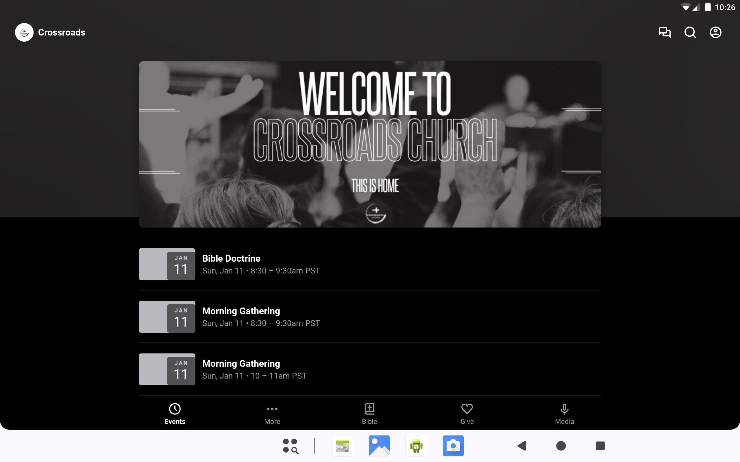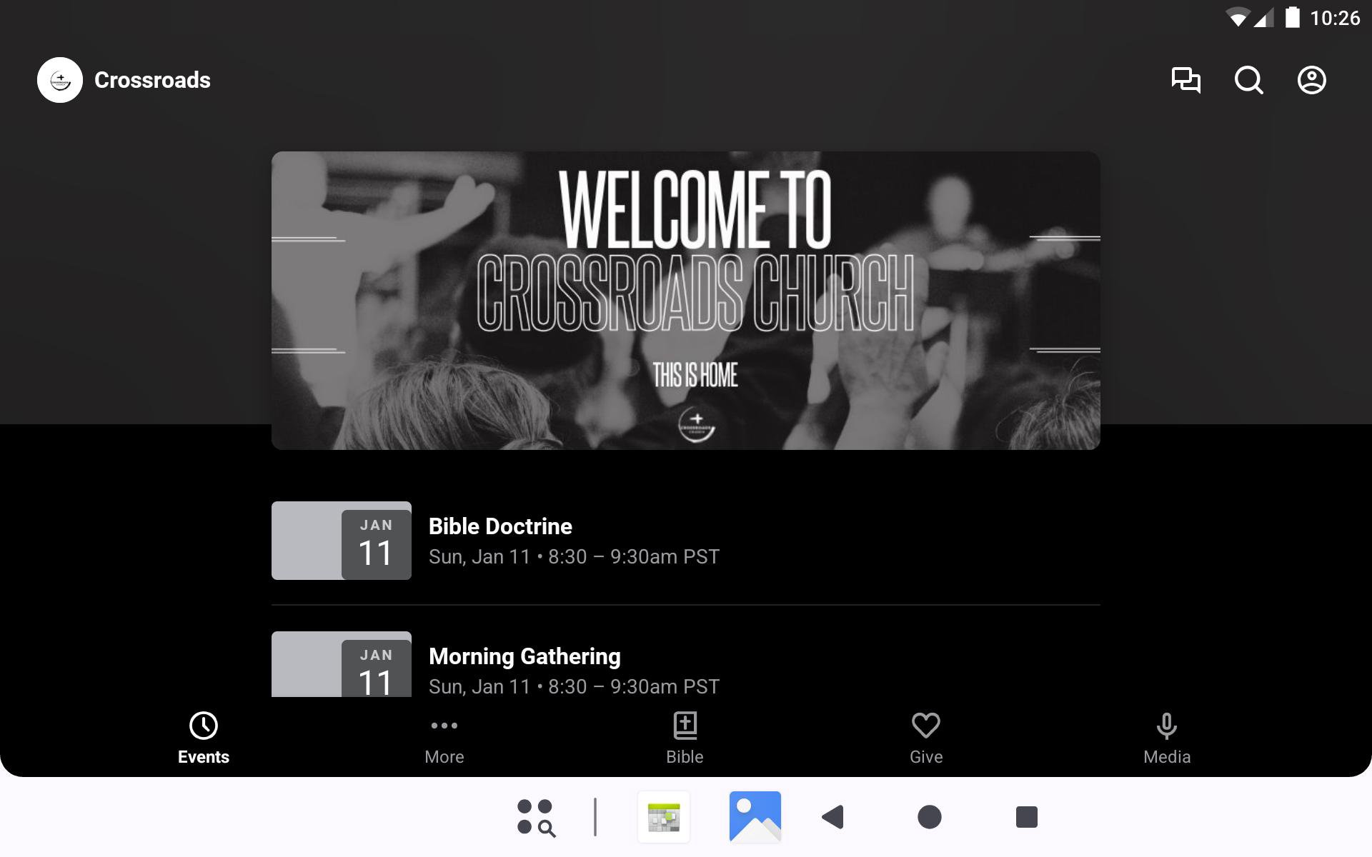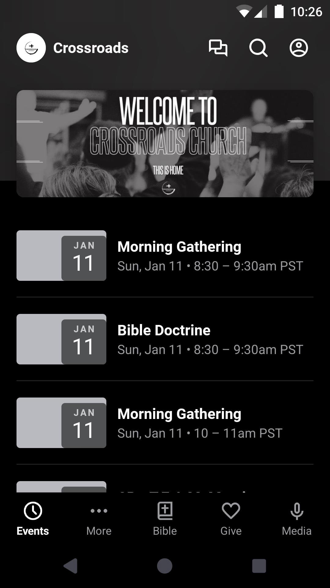 The Crossroads Church App provides instant access to upcoming Events, Blog posts, a map to our campus location, a link for Online Giving, and an online Bible with reading plan. Come connect with us!