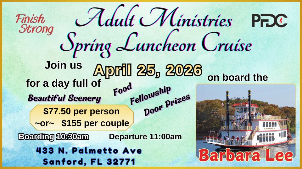 The cruise will begin boarding at 10:30 AM, and leave the dock in Sanford at 11:00AM, returning at 2:00PM. There will be several entrees to choose from, and the scenery and fellowship will be wonderful. There will also be door prizes given away as well.
