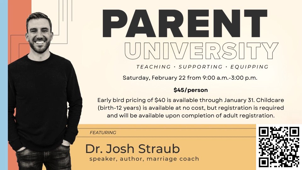 Parents, spend the day learning new skills and investing in yourself at Parent University on Saturday, February 22 from 9:00 a.m.-3:00 p.m. in the Crossings OKC Venue (14600 N Portland). This one-day conference features Dr. Josh Straub who will teach about the biblical foundation for cultivating an emotionally safe and healthy home for kids of all ages.