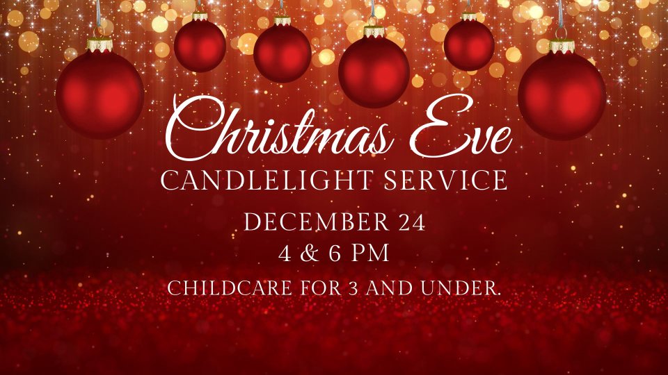 Join us at 4 or 6 pm for our Christmas Eve Candlelight Service. We will sing Christmas Carols, hear a message on "The Promise of His Presence," and end the service with candle-lighting.