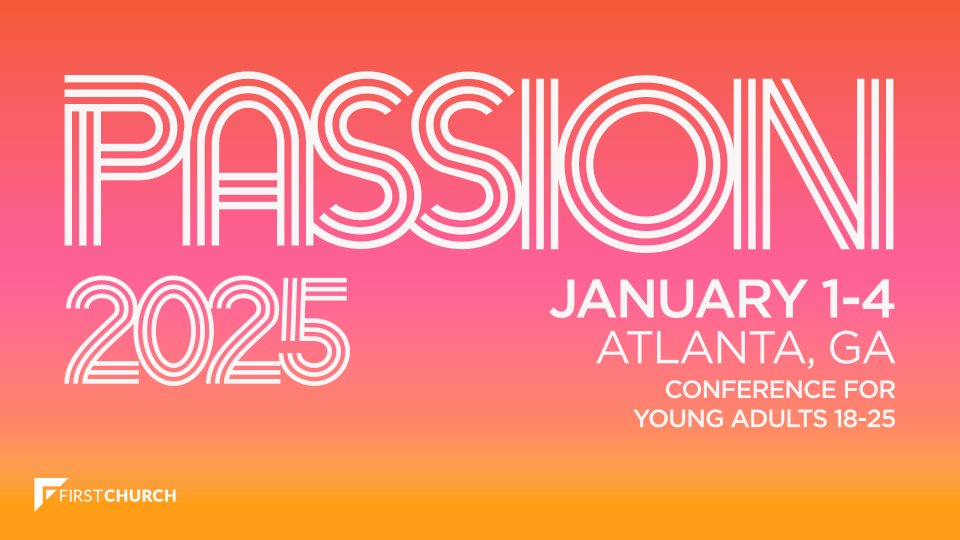 Join our Young Adult ministry at First Church as we head to Atlanta, GA for the Passion 2025 Conference. Passion 2025 is a gathering for 18-25 year olds from across the world who want to glorify God and unite this generation in prayer and worship! The trip dates are Jan. 1-4, 2025. The conference will be held at the State Farm Arena in Atlanta. Registration is required and the deposit is due Dec. 18, 2024. Click the link for more!