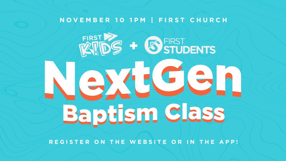 First Kids: Have you ever wondered how to talk about baptism as a family? Come to our NextGen Baptism Class on Nov. 10 from 1-2PM in Room 101. Join the conversation as we talk through what baptism means and what a baptism at First Church looks like. First Students: At First Church, we believe that the primary discipleship of a child happens within the family. During the Jr. High and Sr. High baptism class, we will work through "My Faith Journey." This workbook is designed to get families talking about baptism. We recommend families keep this workbook as they continue the conversation about baptism at home!