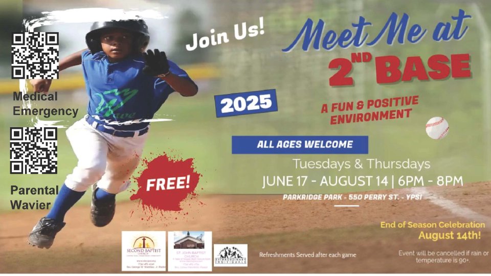 Meet Second Baptist & St. John Baptist Churches each Tuesday & Thursday from 6 pm - 8 pm for some fun Youth Baseball. All ages welcome!