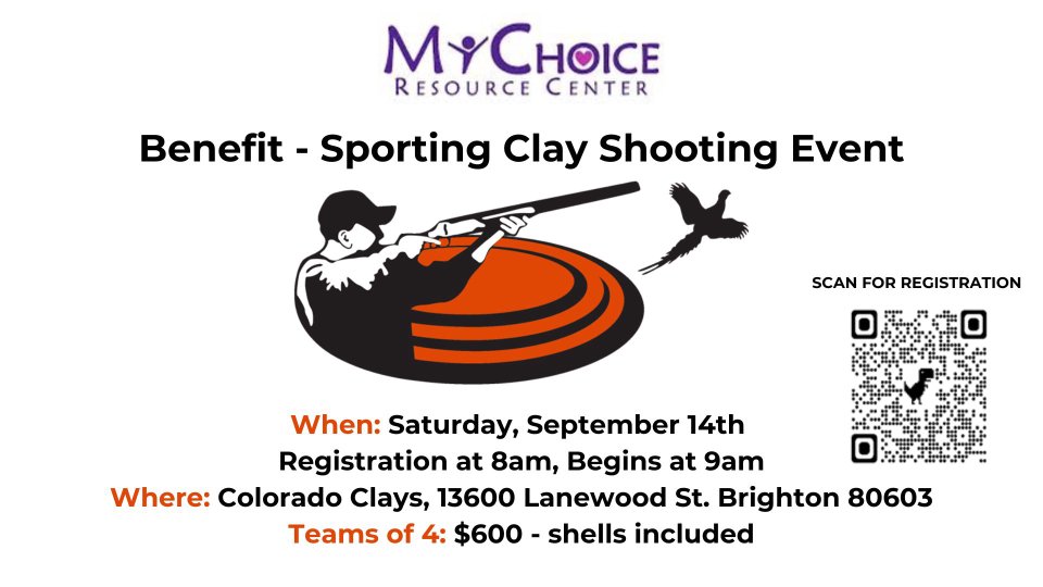 MyChoice Resource Pregnancy Center is having their 2nd annual Sporting Clays Benefit on Saturday, September 14th at Colorado Clays (13600 Lanewood St. Brighton 80603). The cost is $600 for teams of 4 (shells included) and there will be prizes, breakfast, snacks, drinks, and a BBQ dinner. Registration begins at 8am and the event begins at 9am. Please pre-register for the event.