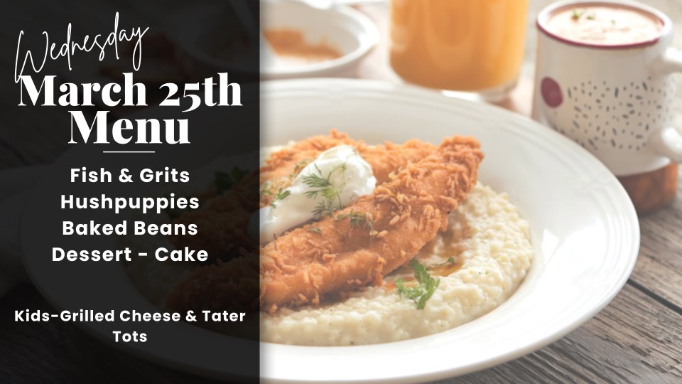 Fish & Grits, Hushpuppies, Baked Beans with Cake for Dessert