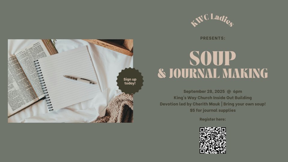 Join the ladies on September 28th at 6pm for soup and journal making! Come hungry and ready to tase some soups! After we've eaten, we'll jump into a devotional led by Cherith Mauk and then we'll get into some journal making! Cost is $5 to cover some of the supplies.