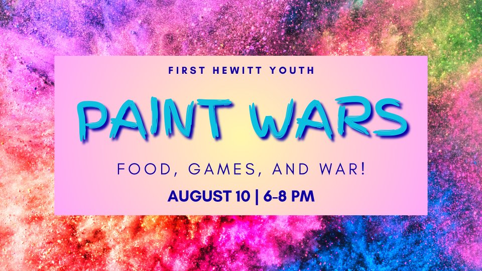 Are you ready for all-out war? Students are invited for food, fun, and paint wars as we celebrate the end of summer. All high school and middle school students are welcome and encouraged to bring a friend! Wear a white t-shirt and clothes that you don't mind getting covered in paint.