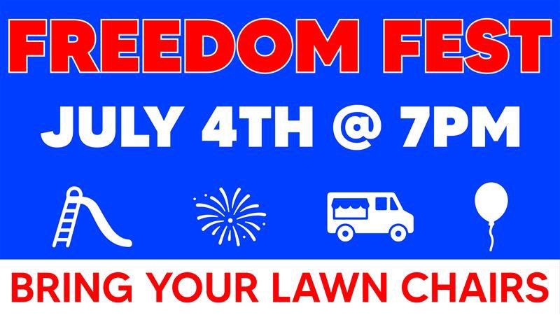 Make plans to join us on Friday, July 4th, at 7 pm for Freedom Fest! Please invite your friends, family, and neighbors to our annual 4th of July celebration. We will have fireworks, food trucks, Inflatables, and water slides. Don't forget to bring your favorite lawn chair. We will see you there!