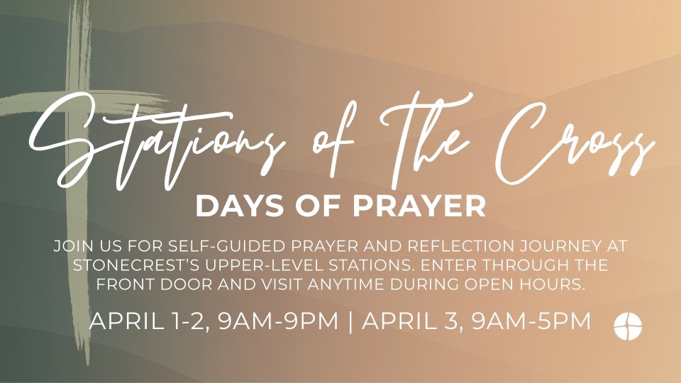 Stations of the Cross is a self-guided time of prayer, reflection and silence through prayer stations on the upper level of Stonecrest. Enter through the front door and come anytime during open hours for any length of time. The stations will be open on April 1, 9am-9pm; April 2, 9am-9pm; April 3; 9am-5pm.