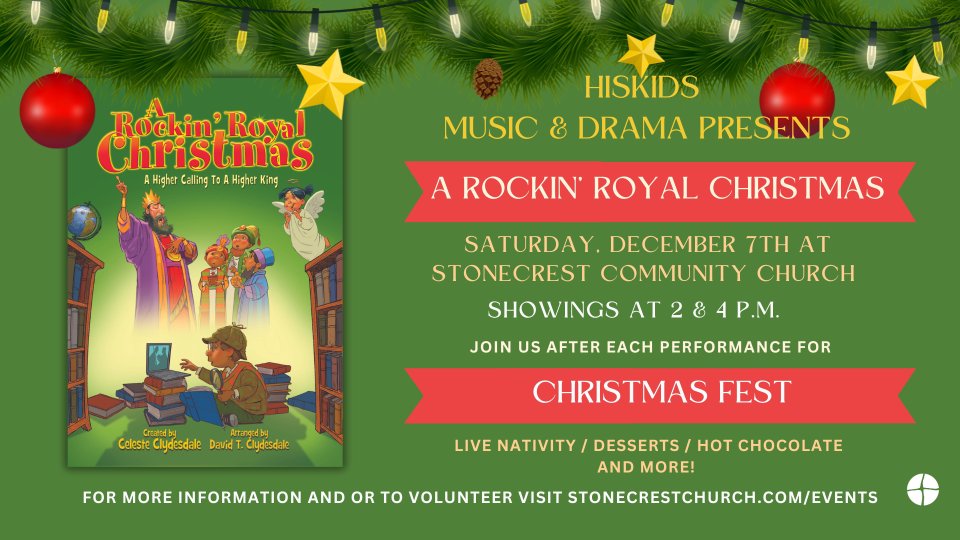 HisKids Music and Drama will present "A Rockin' Royal Christmas" on Saturday, December 7 at 2:00pm and 4:00pm. Following each presentation, Stonecrest will host Christmas Fest with hot beverages, desserts, s'mores at firepits (if allowed) and a live nativity in the grove in front of Stonecrest. Sign-up below if you are able to volunteer for the event or be able to bring donations to support the day.
