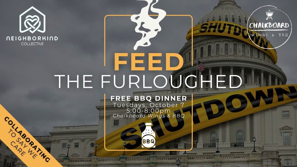 This Tuesday, October 7 from 5-8pm (and every Tuesday until this shutdown ends) come dine at Chalkboard Wings & BBQ, where they are discounting the following meals to just $5 (while meals last!), and Neighborkind Collective is paying the remainder of the tab: smoked chicken quarter with chips OR pulled pork sandwich with chips. Kids options available as well!