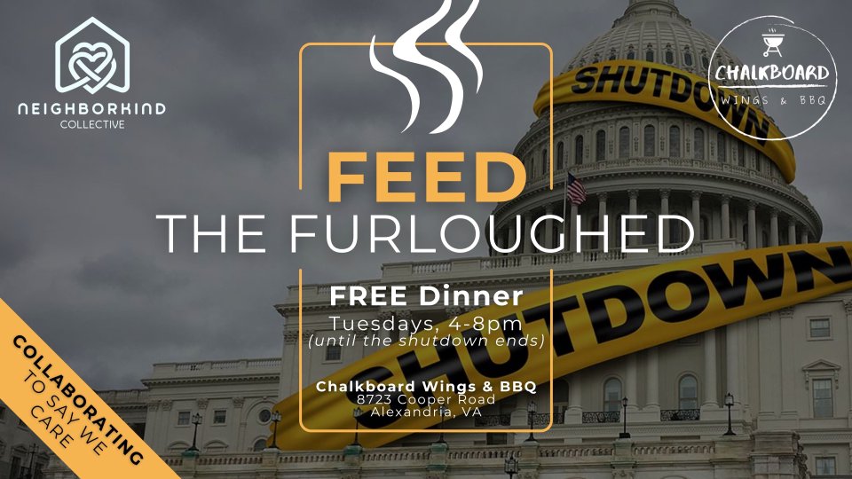 The Neighborkind Collective, a network of churches including The Kingstowne Communion and Franconia UMC, and Chalkboard Wings & BBQ are collaborating throughout the shutdown to provide a FREE meal on Tuesdays from 4-8pm (dine-in or carry out!) as a way to offer support and care to all those affected by the government shutdown.
