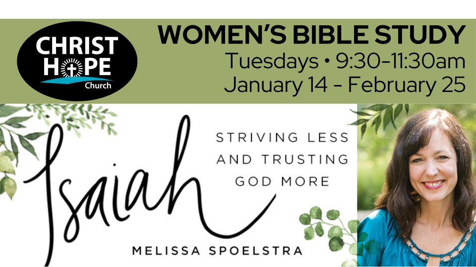We will start our Women’s Bible Study will meet from 9:30 a.m. to 11:30 a.m. from January 14 to February 25, 2025. This is a seven-week study called “Isaiah” by Melissa Spoelstra.