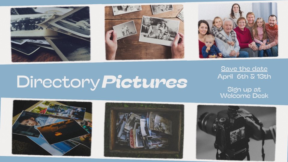 Sign up for a slot to take a family photo for the new church directory. We will have slots available from 8:00 AM to 12:30 PM on April 6th & 13th.