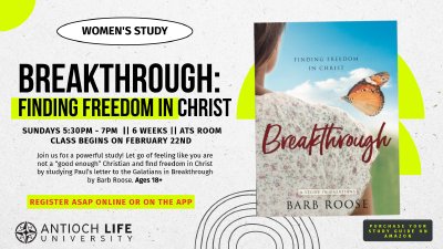 Let go of feeling like you are not a “good enough” Christian and find freedom in Christ by studying Paul’s letter to the Galatians in Breakthrough by Barb Roose. Have you ever felt that being a good Christian means you’ve got to follow a bunch of rules and measure up? If so, you aren’t alone! In this six-week Bible study of Galatians, Barb Roose shows us that even the believers in the early church struggled to let go of rule-keeping and performance in order to embrace God’s free gift of grace. In his letter to the Galatians, Paul pours out his heart and faith to set them straight, addressing so many of the same questions and problems we still face today, such as… - Who has led you to believe you have to follow rules to be right with God? - Why do you think you have to try to be perfect for God? - How do we stay free in Christ? If you’ve ever struggled with these questions or felt trapped by rules or religion, this study will provide a path to discover your freedom in Christ. Through this study, women will learn to: - Stop trying to measure up and embrace God’s grace - Distinguish between lies and truth - Embrace God’s promise of freedom SUNDAYS 5:30PM - 7PM || 6 WEEKS || ATS ROOM CLASS BEGINS ON FEBRUARY 22ND REGISTER ASAP ONLINE, THE APP, OR ON THE LINK BELOW