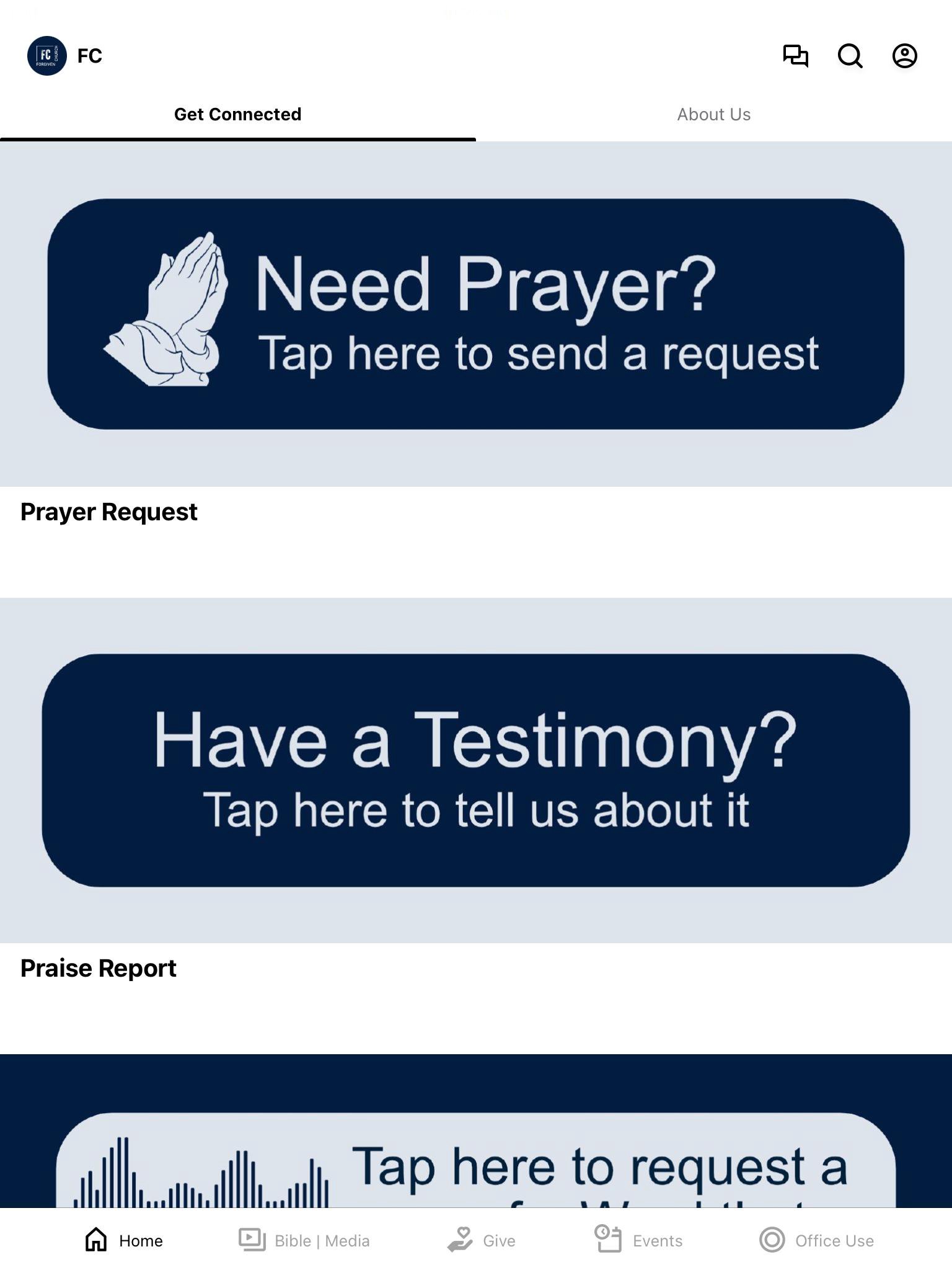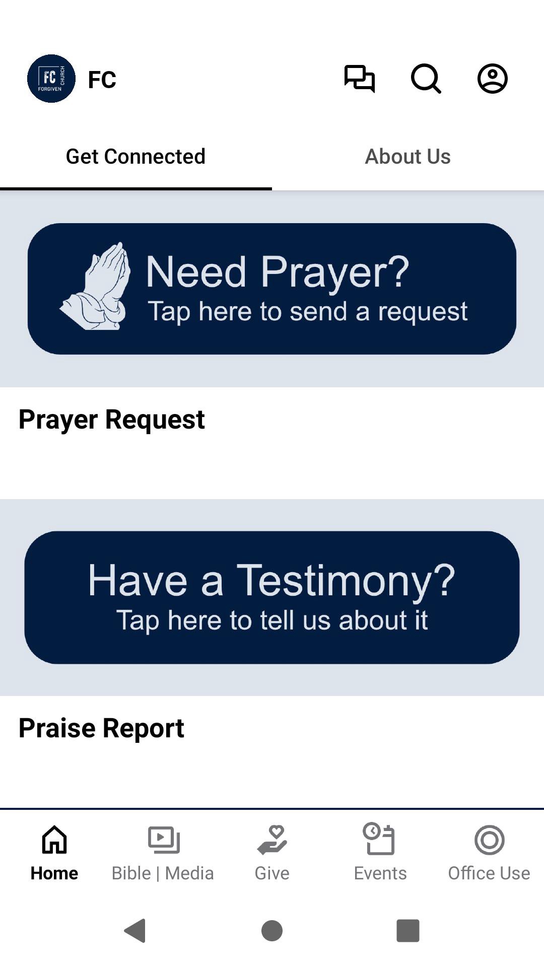 This app will help you stay connected with the day-to-day life of our church. With this app you can: • Watch or listen to current and past messages (church services, men's ministry meetings, and women's ministry meetings) • Sign up for push notifications for categories you want to stay updated on • Share your favorite messages via Twitter, Facebook, or email • Download messages for offline listening • Give directly in the app • Read our weekly blog, "Grit" • And MORE! Check out the great content in the Bible | Resources Tab!