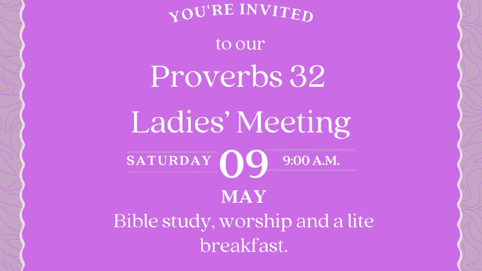 Proverbs 32 is a ministry emphasis focusing on taking Biblical life lessons and applying them to everyday life situations. All ladies are invited for a time of spiritual refreshing from God's Word. Meeting takes place in the social hall.
