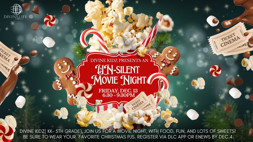 Parents, Divine Kidz will host an Un-Silent Night with a movie, fun and sweets! Divine Kids (AGES KK- 5th GRADE ONLY) will be provided food and are encouraged to wear their Christmas Pajamas!