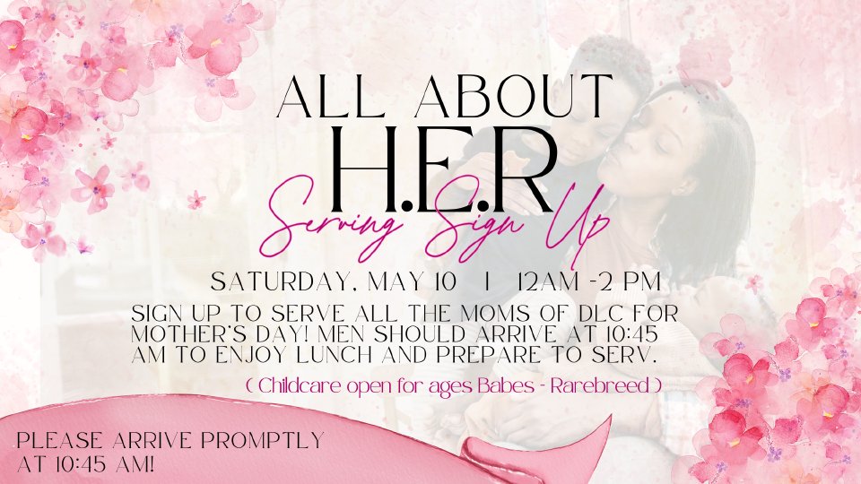 Sign up to serve all the moms of DLC for mother’s day! Men should arrive at 9:45 am to enjoy lunch and prepare to serve.