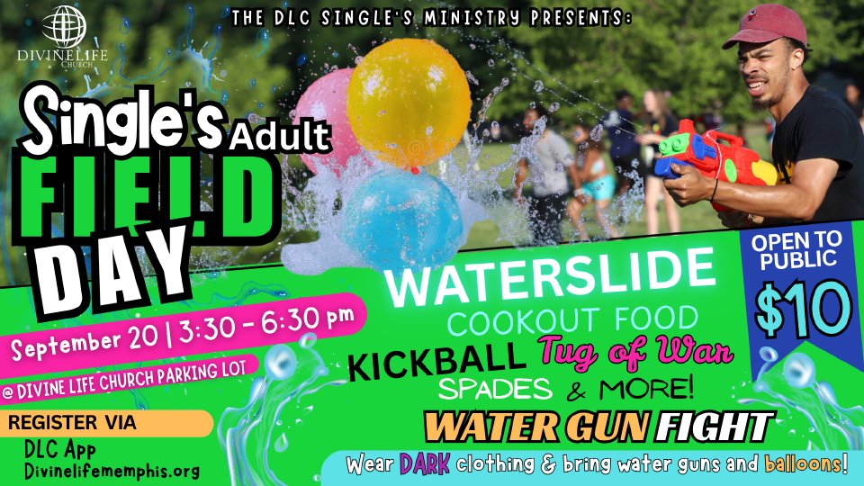 Singles, bring your friends and join us for an ADULT Field day complete with cookout food, water gun and balloon fights, water slide, spades, and more! This is an Adult only event and is open to the public. Please wear dark clothing ONLY and bring your water guns and water balloons with you. Registration closes Saturday, September 13th.
