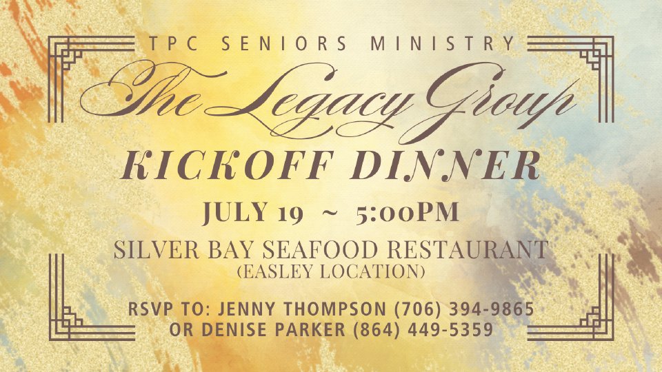 Dinner at Silver Bay in Easley to kickoff The Legacy Group (TPC's Seniors Ministry)