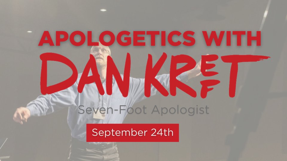 Join us at 6:30 pm for a free dinner and fellowship before apologetics starts at 7 pm. Dan Kreft, the seven-foot apologist, will be speaking. Childcare is provided.
