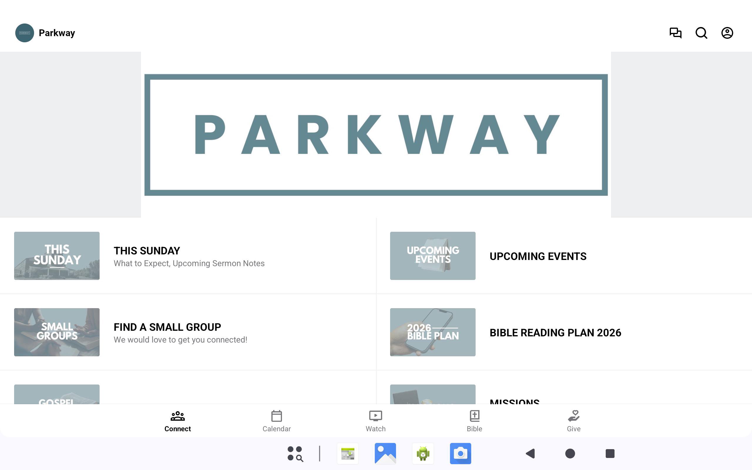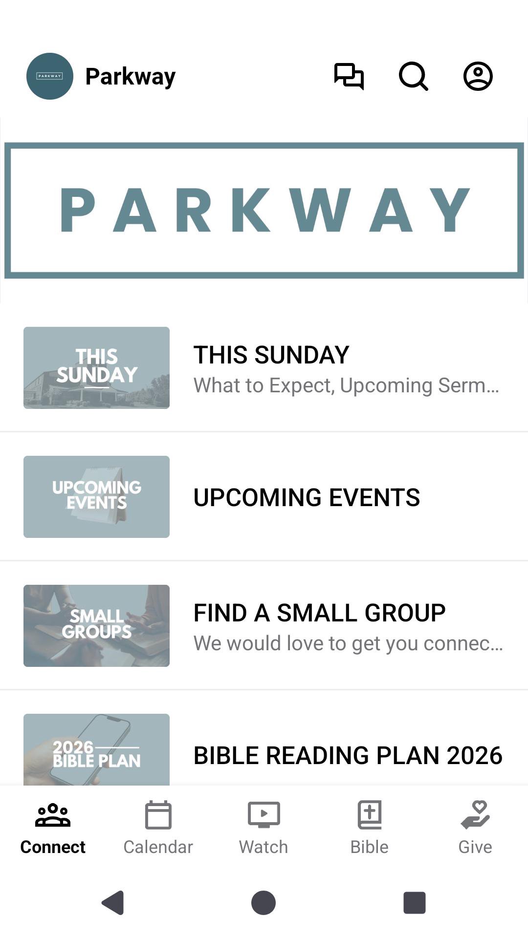 This app will connect users to the Parkway Baptist Church family where they can view sermon media and live streams, make online donations, view and register for upcoming events, view Bible reading plans, connect with Small Groups, manage volunteer scheduling, and more.