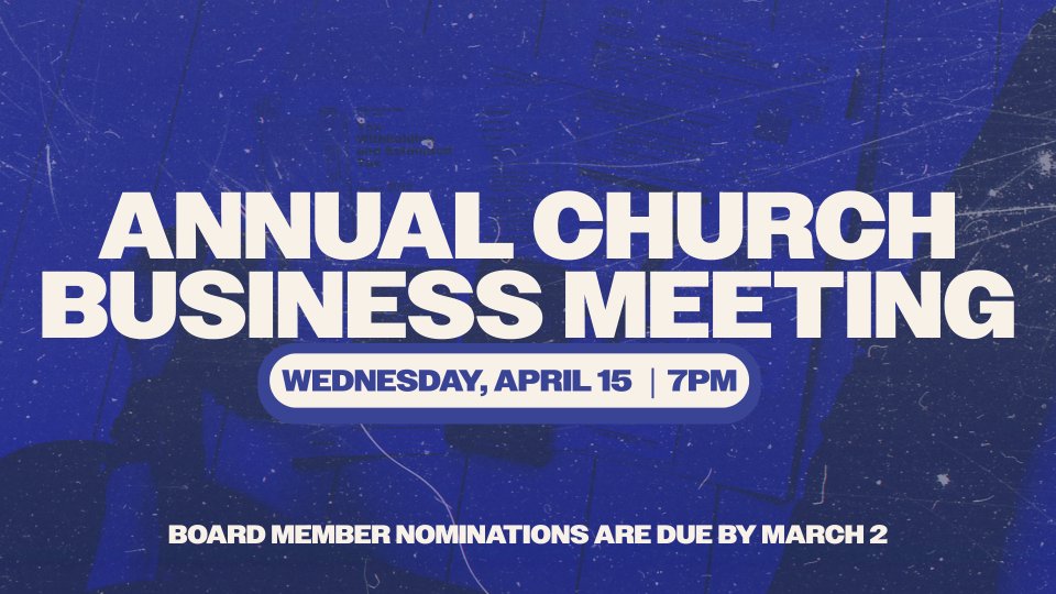 Join us Wednesday, April 15 for the Annual Church Business Meeting at 7pm in the auditorium. We will celebrate all that God has done at CrossPoint and look forward to all that God is going to do in the future. All members are encouraged to attend.